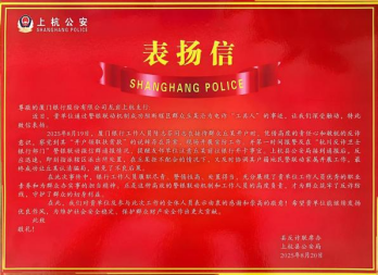 8月21日,上杭县公安局副局长陈文亮、县反诈联席办专职副主任张朝进、中国人民银行龙岩市分行上杭营业管理部副主任吴少雄专程来到厦门银行龙岩上杭支行,为当值柜员和营业部主任颁发表扬信。他们高度肯定了工作人员的责任意识和专业素养,强调此次成功拦截是警银联动防范电信诈骗的典型范例,充分展现了金融机构在守护群众资金安全中的重要作用。