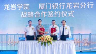仪式上,厦门银行龙岩分行与龙岩学院签署战略合作协议。龙岩学院经济与管理学院副书记、院长黄可权,厦门银行龙岩分行党委书记、负责人余勇分别代表双方签约。