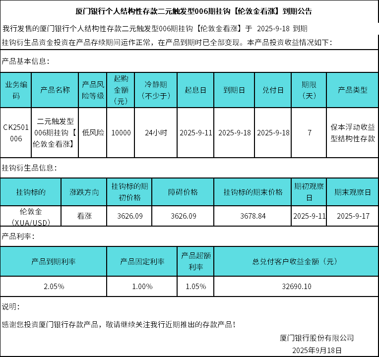 厦门银行个人结构性存款二元触发型006期挂钩【伦敦金看涨】到期公告