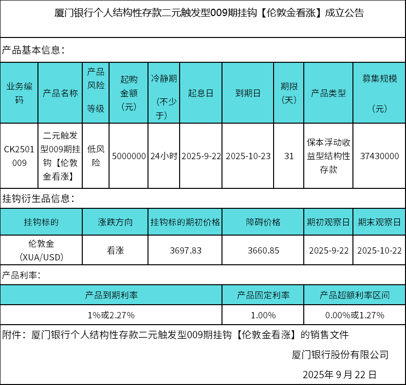 厦门银行个人结构性存款二元触发型009期挂钩【伦敦金看涨】成立公告 日期:2025-09-22 16:40:50 厦门银行个人结构性存款二元触发型009期挂钩【伦敦金看涨】销售文件.zip 返回 下一篇