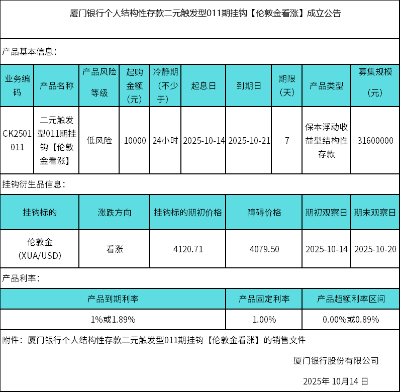 厦门银行个人结构性存款二元触发型011期挂钩【伦敦金看涨】成立公告 日期:2025-10-14 14:35:23 厦门银行个人结构性存款二元触发型011期挂钩【伦敦金看涨】销售文件.zip 返回 下一篇