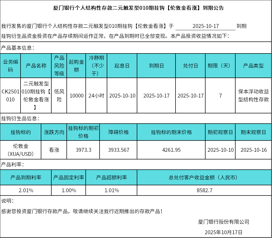 厦门银行个人结构性存款二元触发型010期挂钩【伦敦金看涨】到期公告