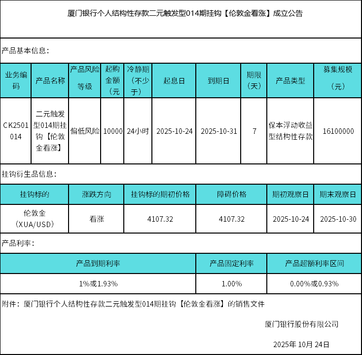 厦门银行个人结构性存款二元触发型014期挂钩【伦敦金看涨】成立公告 日期:2025-10-24 14:40:26 厦门银行个人结构性存款二元触发型014期挂钩【伦敦金看涨】销售文件.zip 返回 下一篇