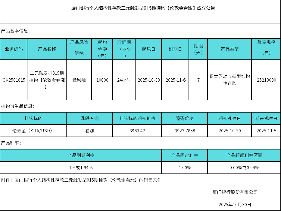 厦门银行个人结构性存款二元触发型015期挂钩【伦敦金看涨】成立公告 日期:2025-11-04 16:24:21 厦门银行个人结构性存款二元触发型015期挂钩【伦敦金看涨】销售文件.zip 上一篇 返回 下一篇