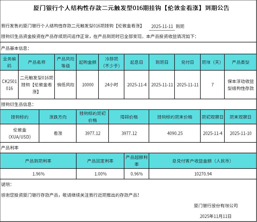 厦门银行个人结构性存款二元触发型016期挂钩【伦敦金看涨】到期公告