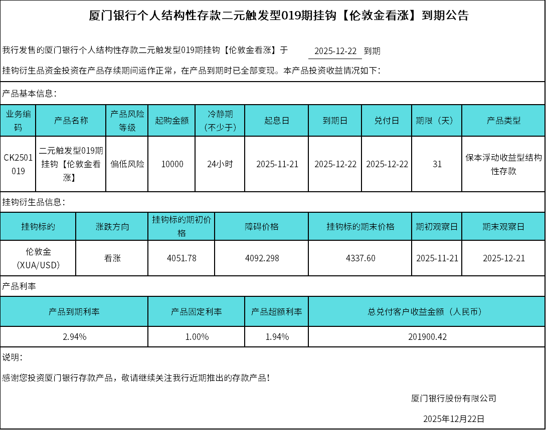 厦门银行个人结构性存款二元触发型019期挂钩【伦敦金看涨】到期公告