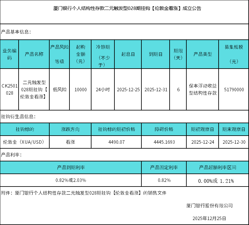 厦门银行个人结构性存款二元触发型028期挂钩【伦敦金看涨】成立公告 日期:2025-12-25 18:24:43 厦门银行个人结构性存款二元触发型028期挂钩【伦敦金看涨】销售文件.zip 上一篇 返回 下一篇