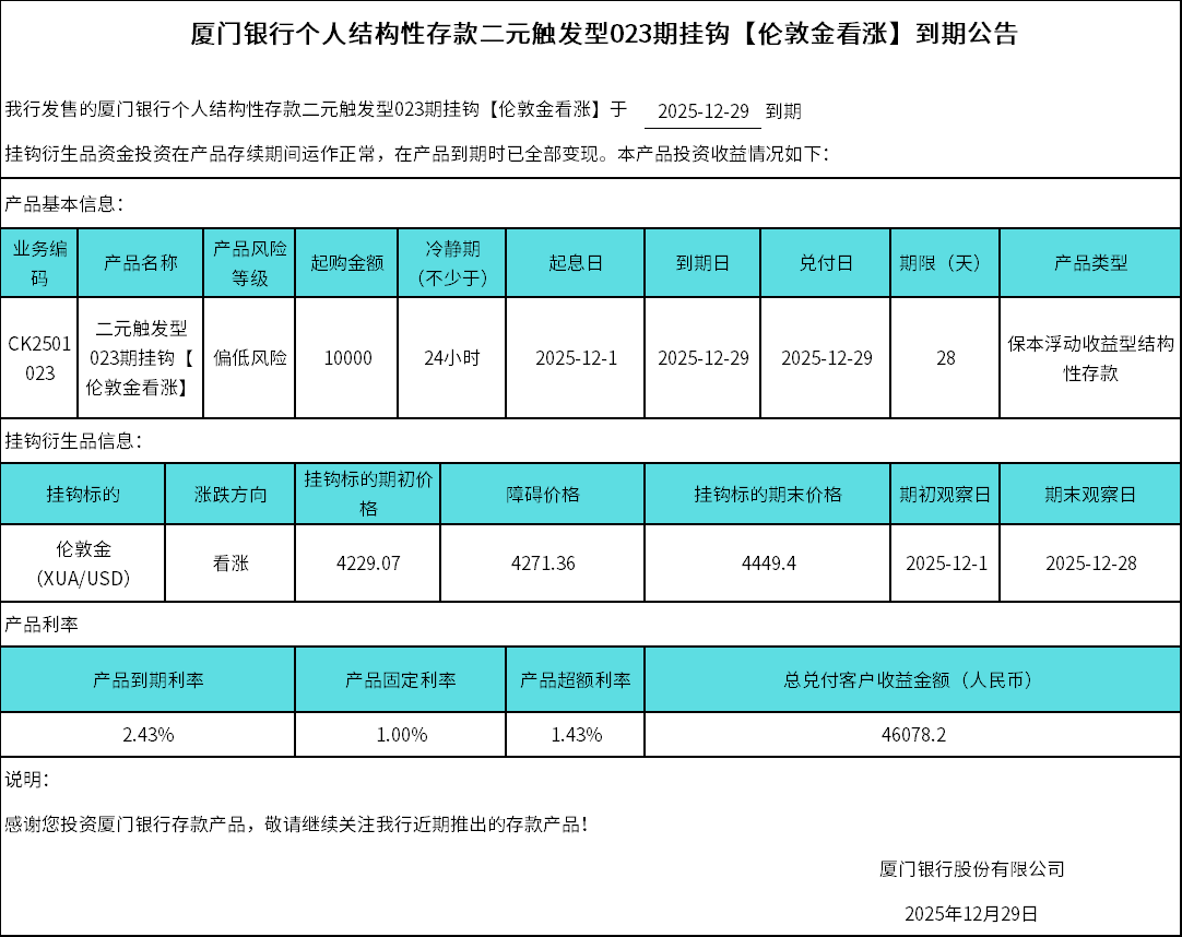 厦门银行个人结构性存款二元触发型023期挂钩【伦敦金看涨】到期公告
