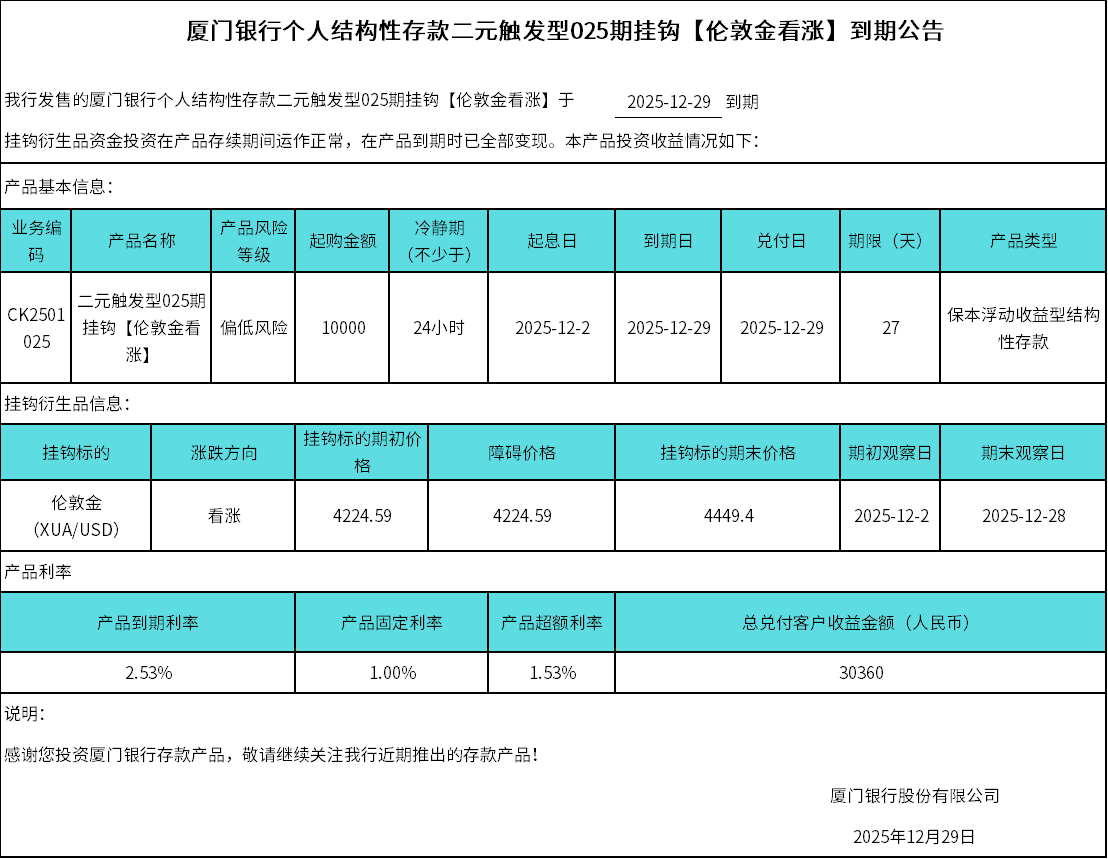 厦门银行个人结构性存款二元触发型025期挂钩【伦敦金看涨】到期公告