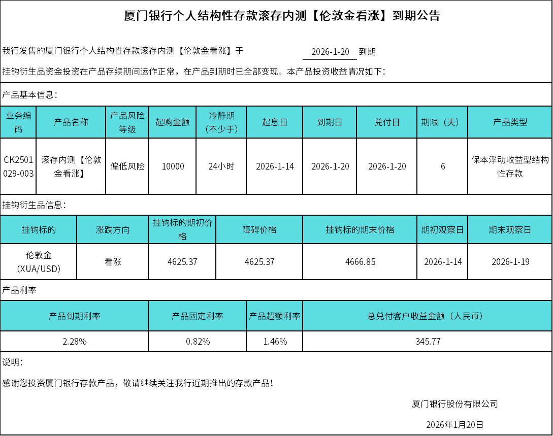 厦门银行个人结构性存款滚存内测【伦敦金看涨】到期公告