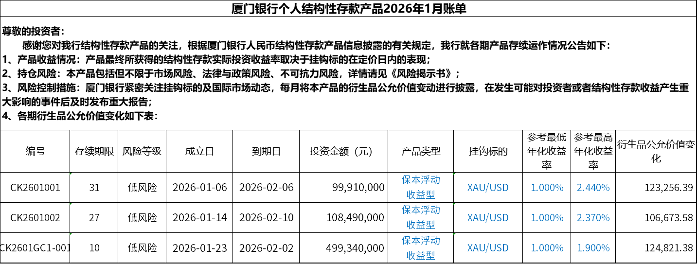 厦门银行个人结构性存款产品2026年1月账单