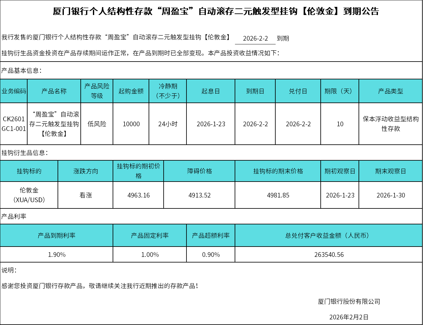 厦门银行个人结构性存款“周盈宝”自动滚存二元触发型挂钩【伦敦金】到期公告