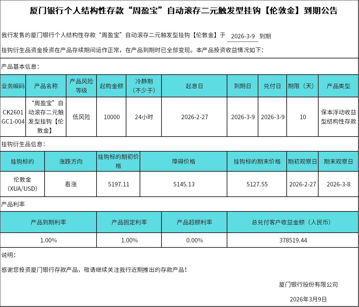 厦门银行个人结构性存款“周盈宝”自动滚存二元触发型挂钩【伦敦金】到期公告