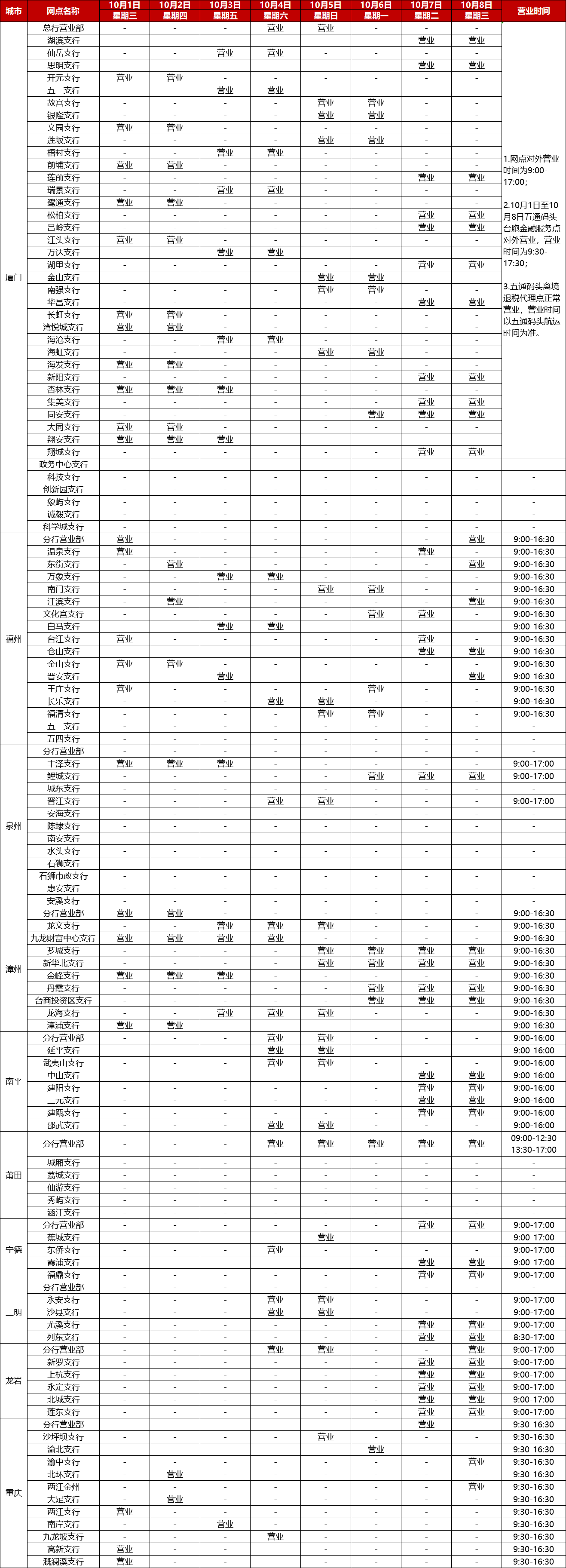 厦门银行2025年国庆中秋节假期网点对外营业时间通告